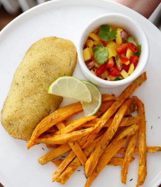 - Készítsd el a mangós salsa szószt. Hámozd meg a mangót, majd kockázd fel. A hagymát aprítsd, a paprikát kockázd fel. Adj hozzá egy kis sót, olívaolajat, a jól felaprított chili paprikát, és facsard rá a lime-ot. Tálalás előtt korianderlevéllel díszítsd.